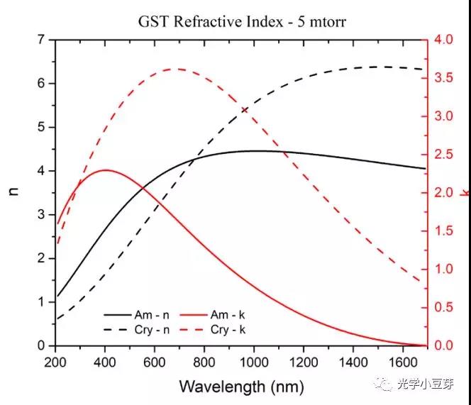 關(guān)于相變材料(phase changing material, 以下簡(jiǎn)稱PCM), 小豆芽之前的一篇筆記 基于光芯片的內(nèi)存內(nèi)計(jì)算(memory-in computing)提到過(guò)。研究人員采用相同的材料GST(全稱為Germanium Antimony Tellurium), 它可以在晶體和非晶態(tài)之間切換。GST通過(guò)濺射的方法沉積在SiN波導(dǎo)上方。GST的折射率隨波長(zhǎng)變化曲線如下圖所示, 當(dāng)PCM處于非晶態(tài)時(shí),它的吸收率較小,而當(dāng)它處于晶體態(tài)時(shí),吸收率較大?;谶@一性質(zhì),它可以作為神經(jīng)網(wǎng)絡(luò)的權(quán)重單元(weights),用來(lái)調(diào)控SiN波導(dǎo)中的光強(qiáng),