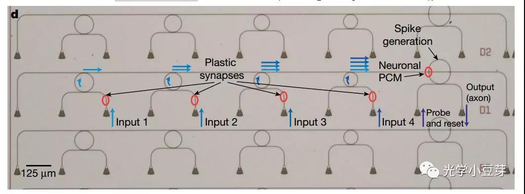 比較上面兩幅圖片,可以看出光學(xué)脈沖神經(jīng)網(wǎng)絡(luò)的結(jié)構(gòu)與生物神經(jīng)元結(jié)構(gòu)非常類似,兩者之前存在一種對(duì)應(yīng)關(guān)系。對(duì)于光學(xué)脈沖神經(jīng)網(wǎng)絡(luò),不同波長(zhǎng)的光脈沖序列輸入進(jìn)PCM構(gòu)成的突觸單元(synapse), 經(jīng)過(guò)PCM的作用,脈沖強(qiáng)度發(fā)生變化,對(duì)應(yīng)于乘法器。進(jìn)而借助于微環(huán)結(jié)構(gòu),將不同波長(zhǎng)的脈沖導(dǎo)入進(jìn)同一波導(dǎo)中,該功能類似加法器。相加后的脈沖光強(qiáng)較小時(shí),probe光與微環(huán)發(fā)生共振,在輸出端口沒(méi)有光強(qiáng)輸出。當(dāng)光強(qiáng)達(dá)到一定的閾值后,probe信號(hào)不再和微環(huán)發(fā)生共振,而是傳播到輸出端口。這一過(guò)程類似神經(jīng)元脈沖信號(hào)的激發(fā),扮演了非線性激活函數(shù)的功能?;镜墓鈱W(xué)結(jié)構(gòu)單元如下: