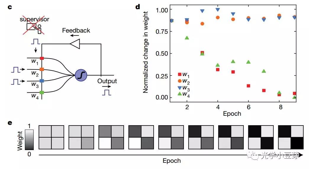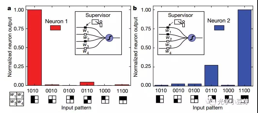 利用上圖的單個(gè)神經(jīng)元結(jié)構(gòu),研究人員驗(yàn)證了監(jiān)督式機(jī)器學(xué)習(xí)和非監(jiān)督式機(jī)器學(xué)習(xí)。對(duì)于監(jiān)督式機(jī)器學(xué)習(xí),權(quán)重的數(shù)值通過(guò)外部的supervisor設(shè)置。
