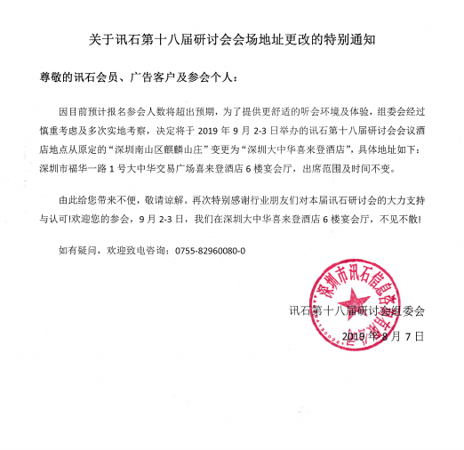 關(guān)于訊石第十八屆研討會會場地址更改的特別通知
