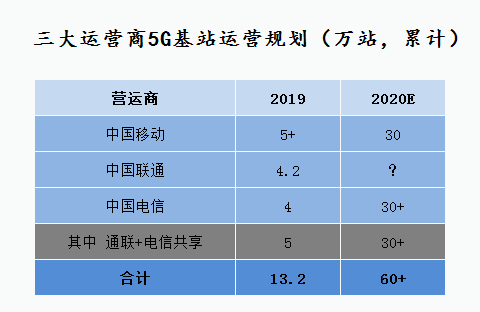 而實(shí)際上,截至2019年底,三大運(yùn)營(yíng)商建成5G基站約13.2萬(wàn)站;其中中國(guó)聯(lián)通和中國(guó)電信共享基站達(dá)到5萬(wàn)站。2020年,中國(guó)移動(dòng)計(jì)劃新增25萬(wàn)基站,總數(shù)達(dá)到30萬(wàn)站;中國(guó)聯(lián)通和電信計(jì)劃三季度新建25萬(wàn)共享基站。中國(guó)電信計(jì)劃2020年建設(shè)14萬(wàn)5G基站,年底總在用5G基站超過30萬(wàn)站。