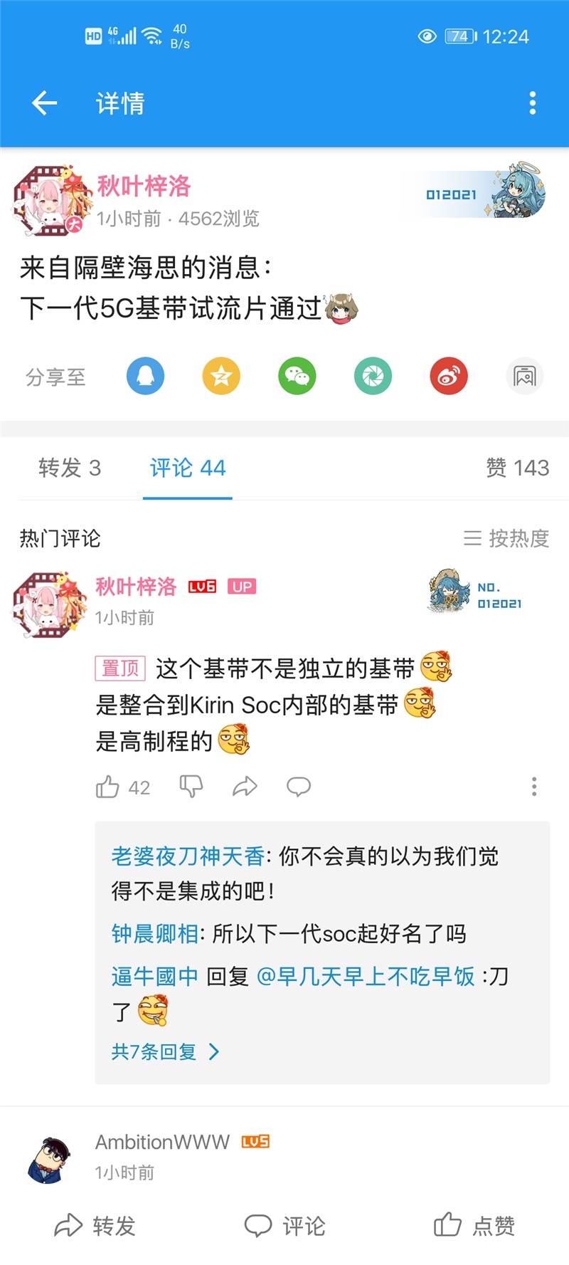 ICC訊 來自嗶哩嗶哩的一位華為工作人員 @秋葉梓洛(人送外號(hào)狐貍姐)透露,新一代海思 5G 基帶試流片已完成,新基帶并非獨(dú)立而是集成于新一代麒麟 Soc 芯片之中。