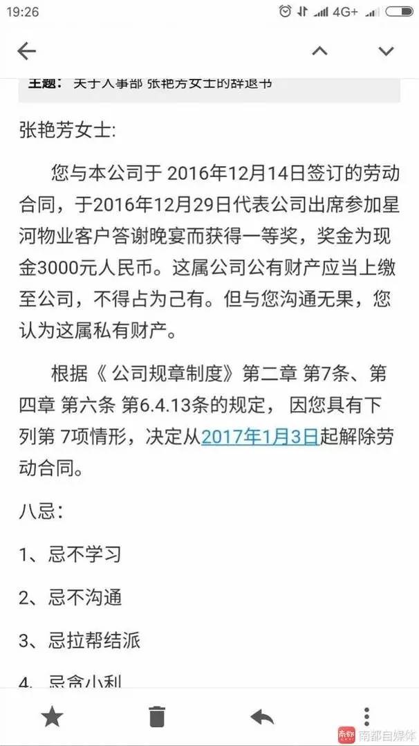 收到辭退郵件的張艷芳很氣憤,她表示自己這次難得“運氣好”抽中現(xiàn)金,因為不上交就被公司辭退也太莫名其妙了,而且該企業(yè)還沒有結清她的工資。