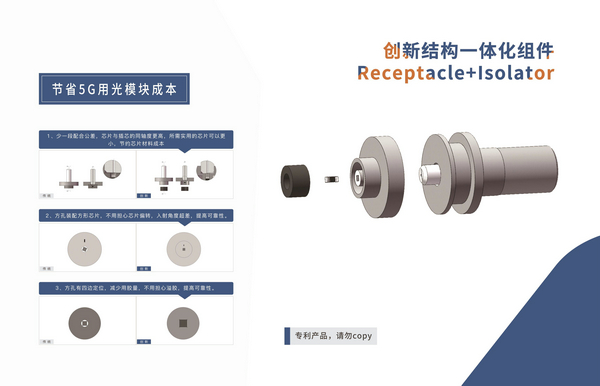 基于對精密技術(shù)的豐富理解,公司推出創(chuàng)新結(jié)構(gòu)Receptacle+Isolator一體化組件,該創(chuàng)新專利產(chǎn)品可以節(jié)約芯片材料成本,提高入射角可靠性以及減少光路溢膠風險。