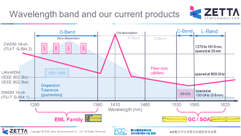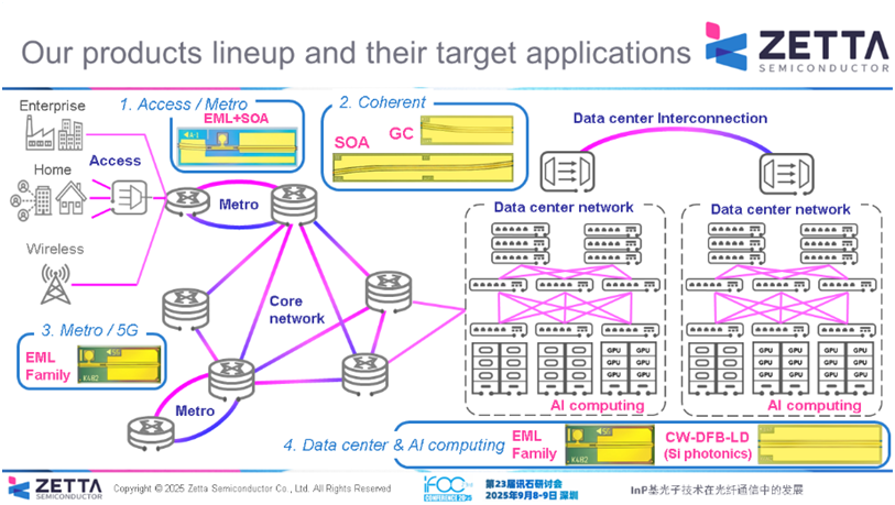 澤達(dá)半導(dǎo)體的核心產(chǎn)品線包括:100Gbps/200Gbps PAM4 電吸收調(diào)制激光器(EML),以及連續(xù)波分布反饋激光器(CW-DFB)、增益芯片Gain chip及半導(dǎo)體光放大芯片SOA。其中,100G PAM4 EML 已進(jìn)入量產(chǎn)階段,主要面向數(shù)據(jù)中心與AI智算;同時(shí),200G PAM4 EML正積極推進(jìn)市場(chǎng)化,以滿足下一代高帶寬應(yīng)用的需求。K-H Huang博士還分享了公司產(chǎn)品及目標(biāo)應(yīng)用場(chǎng)景的深度見解,并著重提及目前正在開展的 EML-SOA 集成技術(shù)與高功率 CW-DFB技術(shù)研發(fā)工作,這些研發(fā)舉措旨在突破當(dāng)前的性能瓶頸,實(shí)現(xiàn)高端光芯片國產(chǎn)自主可控。