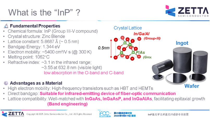 K-H Huang博士回顧了磷化銦基光子學(xué)的發(fā)展起源:1963年光纖通信技術(shù)首次得到驗(yàn)證,隨后長波長低損耗傳輸技術(shù)及磷化銦基激光器相繼問世。他指出,磷化銦具有直接帶隙、高電子遷移率及出色的晶格匹配度等特性,這些都是有源器件創(chuàng)新的關(guān)鍵要素,且六十多年來其實(shí)用性已得到充分驗(yàn)證。K-H Huang博士強(qiáng)調(diào)了磷化銦基光子學(xué)技術(shù)的延展性,并表示該技術(shù)仍將在單波200Gbps/400Gbps數(shù)據(jù)中心及相干光通信領(lǐng)域的發(fā)展中扮演重要的角色。