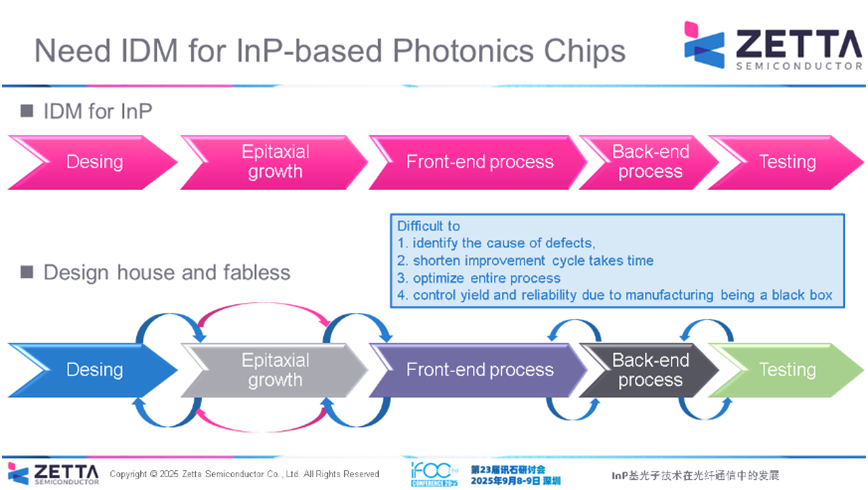 作為國內(nèi)集成器件制造商(IDM),澤達(dá)半導(dǎo)體憑借其在磷化銦(InP)技術(shù)領(lǐng)域的深厚積累,打造了一套從芯片設(shè)計(jì)、外延生長、芯片制造到封裝測(cè)試的垂直整合生產(chǎn)生態(tài)系統(tǒng)。這種全流程技術(shù)能力,使公司能夠推出多元化的高性能光芯片產(chǎn)品組合,可精準(zhǔn)適配各類應(yīng)用場(chǎng)景。對(duì)此,K-H Huang博士表示,自主掌控芯片制造全流程,不僅能確保工藝的穩(wěn)定性與可控性,還能提升產(chǎn)品的可靠性與一致性,這對(duì)于為客戶提供長期、穩(wěn)定的供應(yīng)鏈至關(guān)重要。