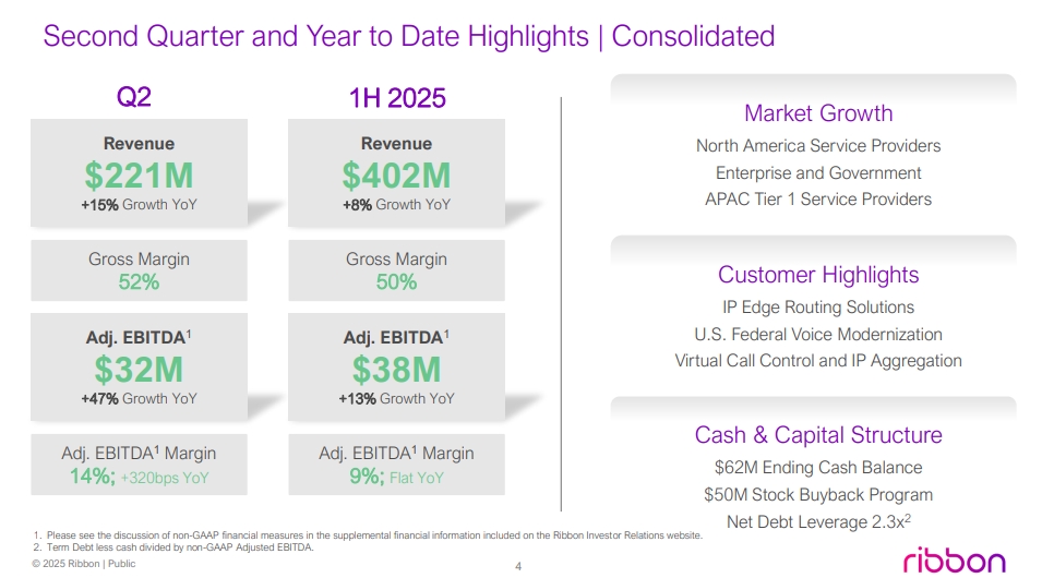 2025年第二季度,Ribbon收入為2.21億美元;2024年第二季度收入為1.93億美元,同比增長(zhǎng)14.5%。2025年二季度GAAP毛利率為49.6%,去年同期為50.8%。2025年二季度凈虧損1100萬美元,2024年二季度凈虧損1700萬美元,虧損減少。