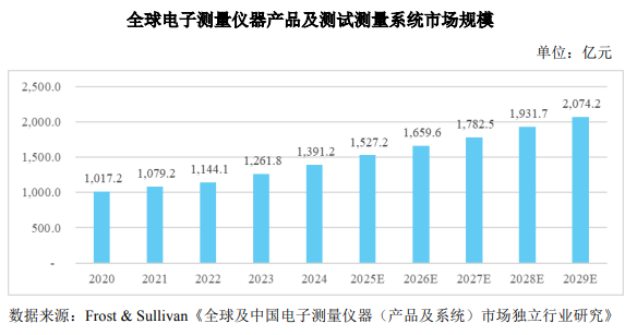 根據(jù)行業(yè)預(yù)測,全球電子測量儀器產(chǎn)品及測試測量系統(tǒng)市場規(guī)模預(yù)計將從2025年的 1,527.2億元 增長至2029年的 2,074.2億元,年均復(fù)合增長率約 7.95%。隨著國內(nèi)政策支持力度加大、下游市場需求持續(xù)釋放以及國產(chǎn)替代進(jìn)程加速,中國電子測量儀器市場有望迎來更高速度增長。