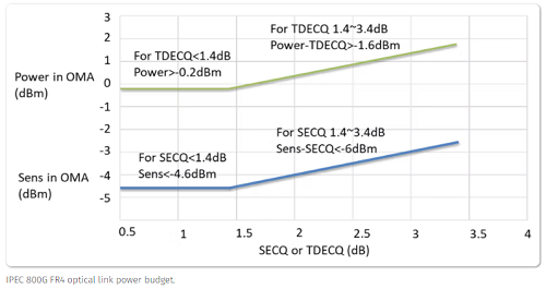 下圖顯示了500米傳輸?shù)?00G DR8光鏈路預算。