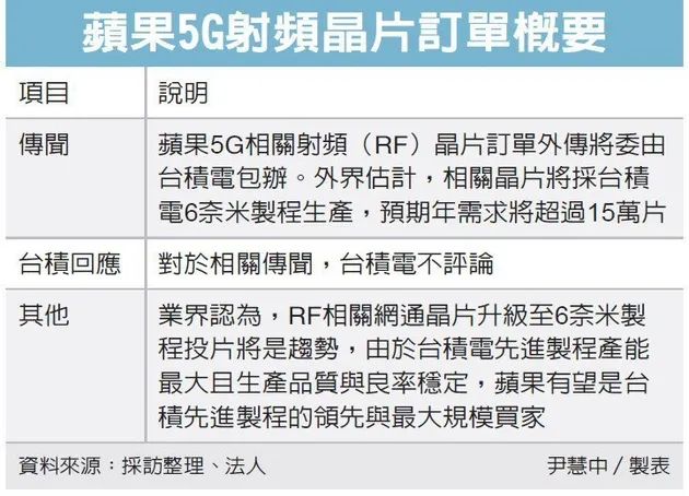 市場人士分析,相關(guān)晶片將采用臺(tái)積電6nm制程生產(chǎn),預(yù)期年需求將超過15萬片。業(yè)界認(rèn)為,RF相關(guān)網(wǎng)通晶片升級(jí)至6nm制程投片將是趨勢(shì),由于臺(tái)積電先進(jìn)制程產(chǎn)能最大且生產(chǎn)品質(zhì)與良率穩(wěn)定,蘋果仍是臺(tái)積先進(jìn)制程最大規(guī)模買家。