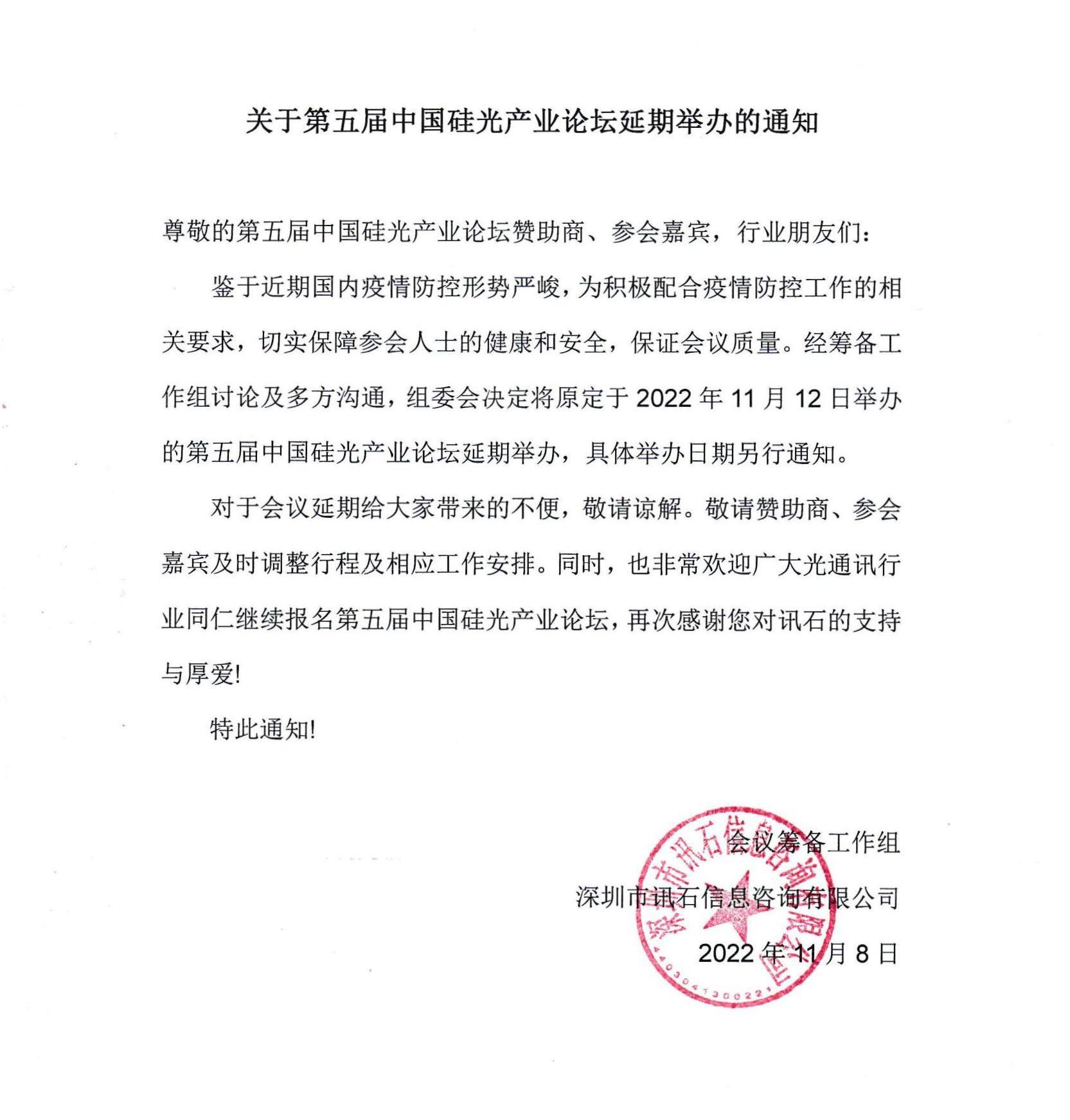 鑒于近期國(guó)內(nèi)疫情防控形勢(shì)嚴(yán)峻,為積極配合疫情防控工作的相關(guān)要求,切實(shí)保障參會(huì)人士的健康和安全,保證會(huì)議質(zhì)量。經(jīng)籌備工作組討論及多方溝通,組委會(huì)決定將原定于2022年11月12日舉辦的第五屆中國(guó)硅光產(chǎn)業(yè)論壇延期舉辦,具體舉辦日期另行通知。