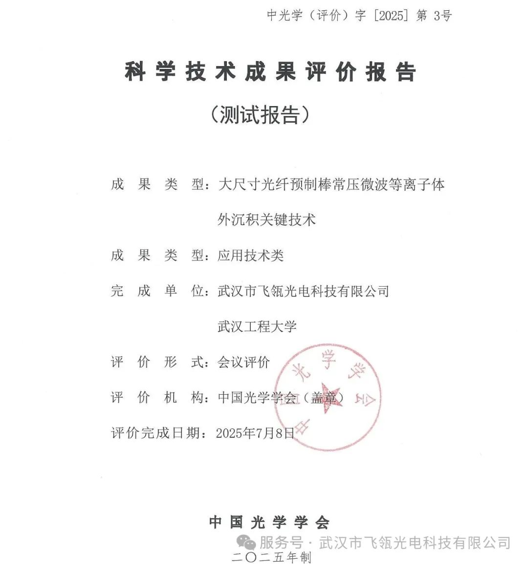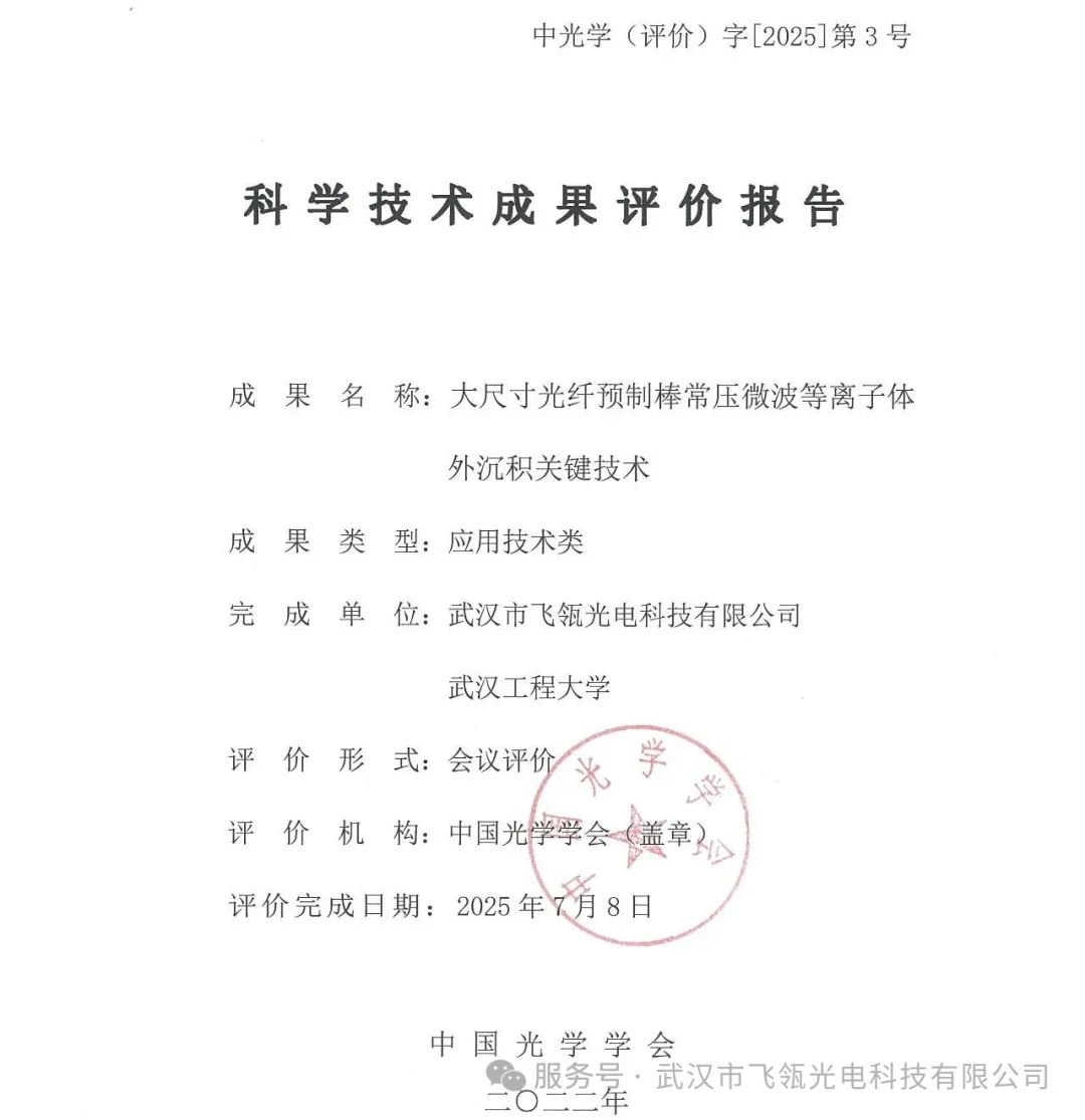 ICC訊 7月8日,中國光學(xué)學(xué)會組織行業(yè)權(quán)威學(xué)者與技術(shù)專家對武漢市飛瓴光電科技有限公司(以下簡稱“ 飛瓴光電”)與武漢工程大學(xué)聯(lián)合研發(fā)的“大尺寸光纖預(yù)制棒常壓微波等離子體外沉積關(guān)鍵技術(shù)”項目開展專項技術(shù)鑒定會議。該項目是校企協(xié)同創(chuàng)新的典型范例,此次會議匯聚了來自科研院所和產(chǎn)業(yè)界的技術(shù)專家,旨在評估該技術(shù)的科學(xué)價值和產(chǎn)業(yè)化工程推廣。中國光學(xué)學(xué)會是由光學(xué)界的科技工作者和有關(guān)企事業(yè)單位自愿結(jié)成、依法登記的全國性、學(xué)術(shù)性、非營利性社會組織,是發(fā)展我國光學(xué)科技事業(yè)的重要社會力量。學(xué)會由兩院院士、兩彈元勛、國家“863”計劃倡導(dǎo)者王大珩先生和嚴濟慈先生等于1979年發(fā)起并成立,1980年起掛靠在中國科學(xué)技術(shù)協(xié)會。