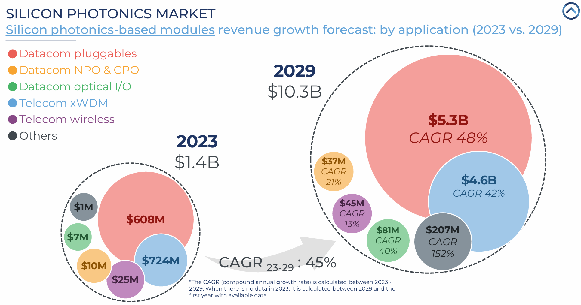 圖1:2023年至2029年硅基光電子模塊收入增長(zhǎng)預(yù)測(cè),顯示各應(yīng)用領(lǐng)域的細(xì)分。