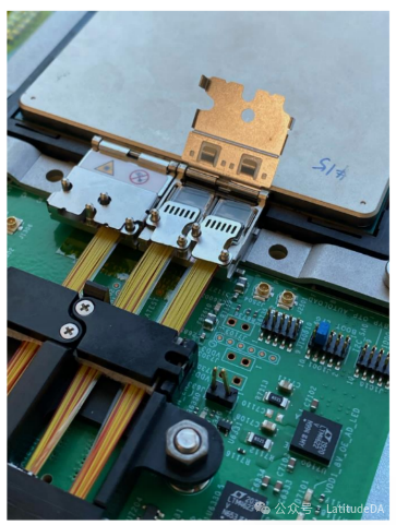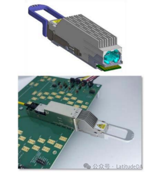 由于硅基光電子無法一體化集成激光器,因此需要使用遠端激光模塊(RLM)提供光源[1]。博通設(shè)計實現(xiàn)熱插拔 RLM,遵循 QSFP-DD 標準,單通道提供高達 21dBm 的光功率并實現(xiàn)安全鎖定(圖 3)[1]。RLM 實現(xiàn)與光引擎的連接器盲配對,方便維護更換。