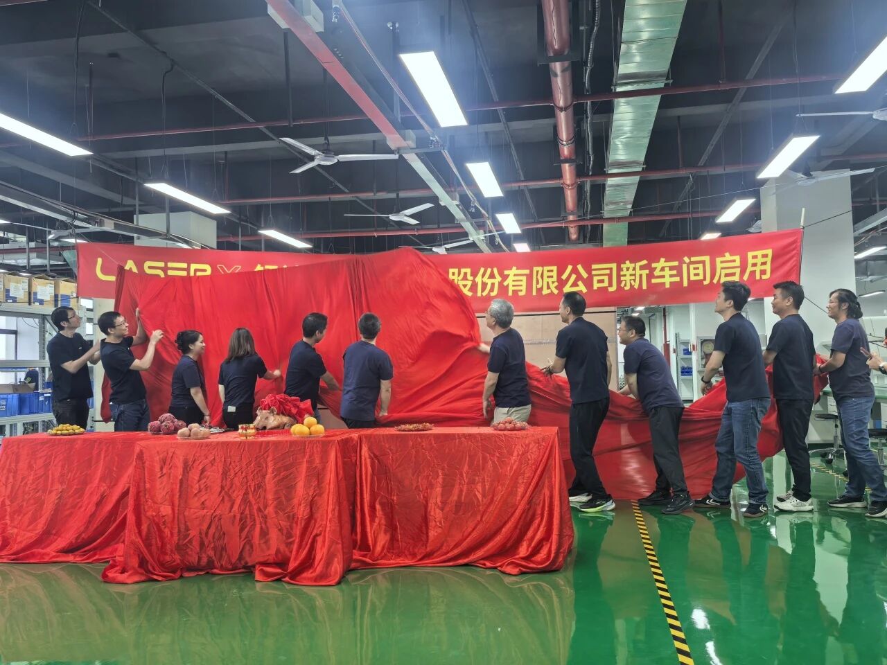 金刀起落,酥脆香豬一分為二,寓意“一刀啟運(yùn)、紅紅火火”,正式宣告兩大新廠房全面投產(chǎn),鐳神技術(shù)產(chǎn)能再躍新峰。