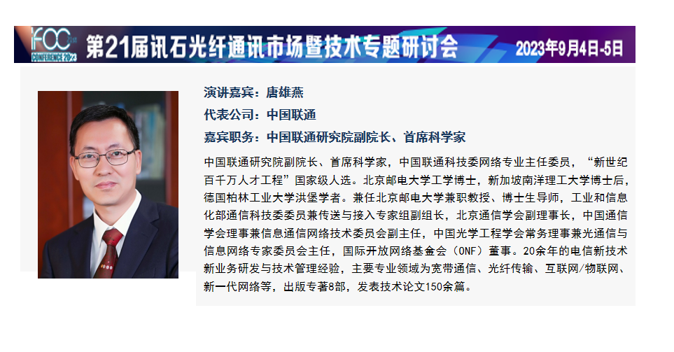 9月5日,中國聯(lián)通研究院副院長、首席科學家唐雄燕博士將在IFOC 2023“算力光網(wǎng)與光纖通信技術發(fā)展論壇”上發(fā)表主題為《算力時代的全光網(wǎng)絡與全光接入新發(fā)展》的演講。