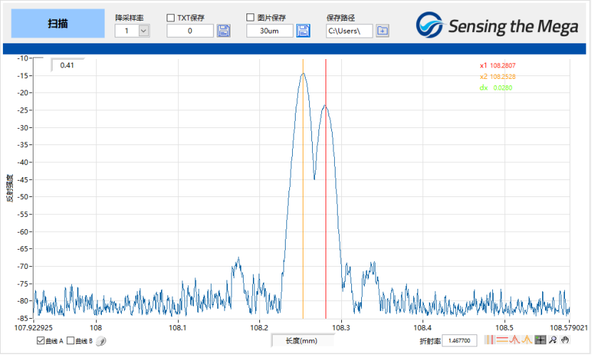 從以上結(jié)果可以看出,在數(shù)十um的距離情況下,OLI可以明顯分辨相鄰兩個(gè)反射事件點(diǎn)(對應(yīng)兩個(gè)事件點(diǎn)反射峰),且本次實(shí)驗(yàn)案例中,兩個(gè)光纖反射端面間隙是空氣,空氣對光的折射率比光纖要更低,如果對應(yīng)測量光纖中某兩個(gè)事件點(diǎn)的距離,則設(shè)備分辨的極限距離將更小。