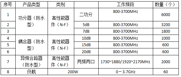 據(jù)公告,本次采購(gòu)資金已落實(shí),預(yù)算32.716萬(wàn)元(不含稅),合同期限自簽訂之日起6個(gè)月或累計(jì)金額達(dá)到預(yù)算100%,以先到者為準(zhǔn)。項(xiàng)目共需采購(gòu)防水型無(wú)源器件15260個(gè),涵蓋功分器、耦合器、異頻合路器及負(fù)載四類。其中,800-3700 MHz頻段二功分器需求最大,數(shù)量為6000個(gè);同頻段5 dB、7 dB、10 dB、15 dB、20 dB耦合器合計(jì)7200個(gè);1730-1880/1920-2170 MHz兩頻兩口異頻合路器2000個(gè);0-3.7 GHz、200 W負(fù)載60個(gè)。具體如下: