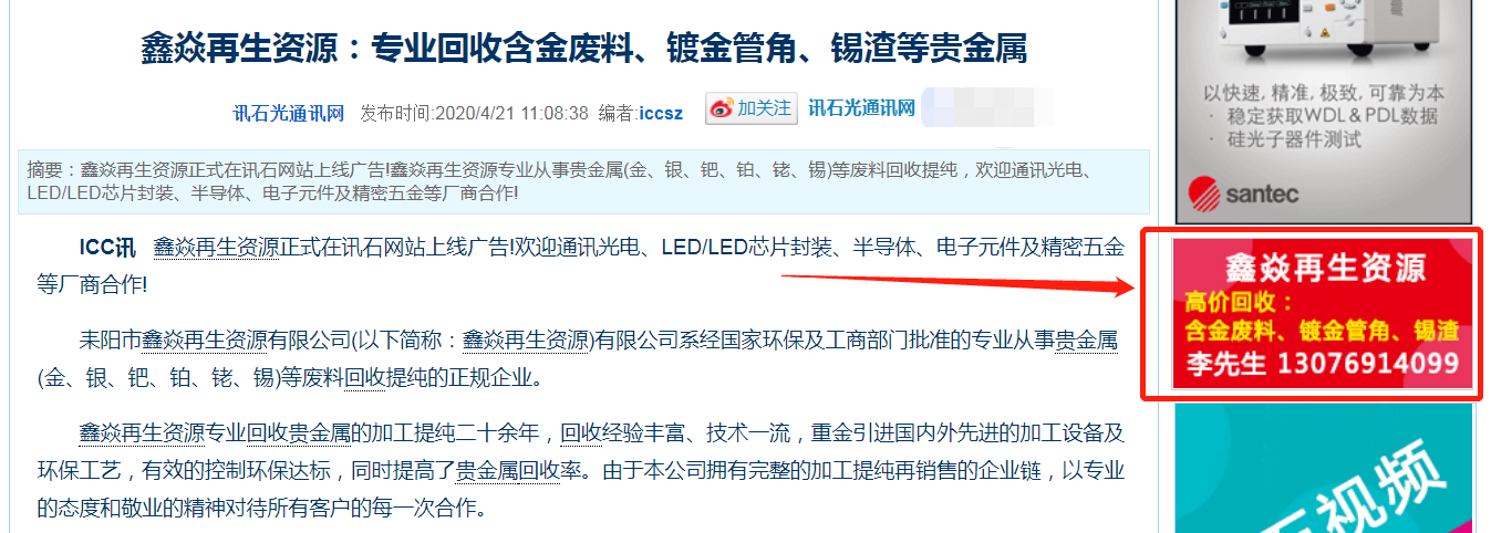 ICC訊 鑫焱再生資源正式在訊石網(wǎng)站上線廣告!歡迎通訊光電、LED/LED芯片封裝、半導(dǎo)體、電子元件及精密五金等廠商合作!