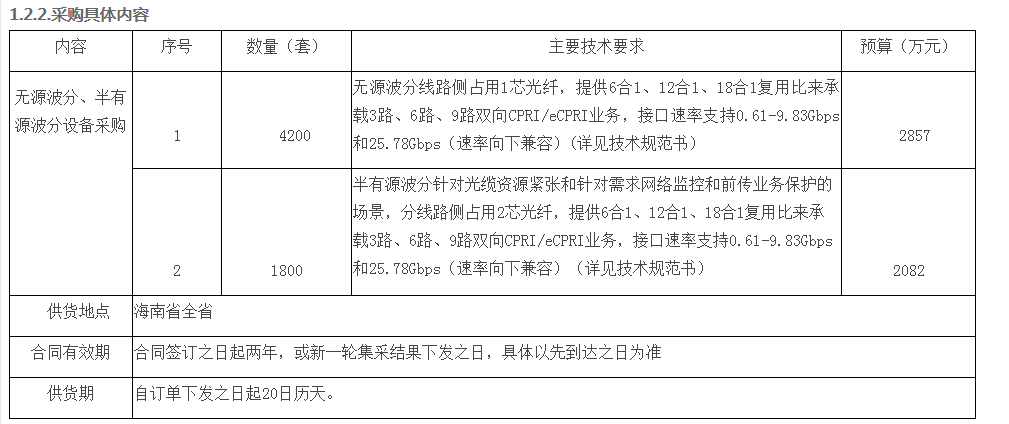 ICC訊 中國移動(dòng)海南公司啟動(dòng)2020-2021年無源波分、半有源波分設(shè)備采購項(xiàng)目(項(xiàng)目編號(hào):HIYD20200000439;招標(biāo)代理機(jī)構(gòu)編號(hào):AZBHNY200010)進(jìn)行比選,采購資金由采購人自籌,并已落實(shí)。具有相應(yīng)資質(zhì)及服務(wù)能力的供應(yīng)商均可前來投標(biāo)。項(xiàng)目含稅預(yù)算4939萬元(增值稅稅率13%),其中標(biāo)包1無源波分設(shè)備預(yù)算2857萬元,標(biāo)包2半有源波分設(shè)備預(yù)算2082萬元。