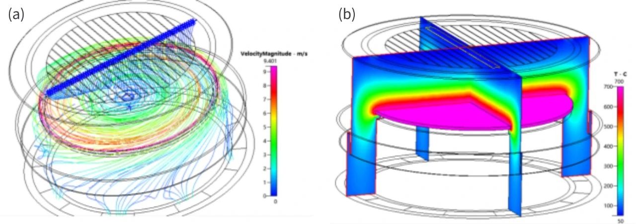 圖3 新型MOCVD設(shè)備反應(yīng)腔模擬(a)流場均勻性模擬;(b)量子阱生長階段的溫場模擬
