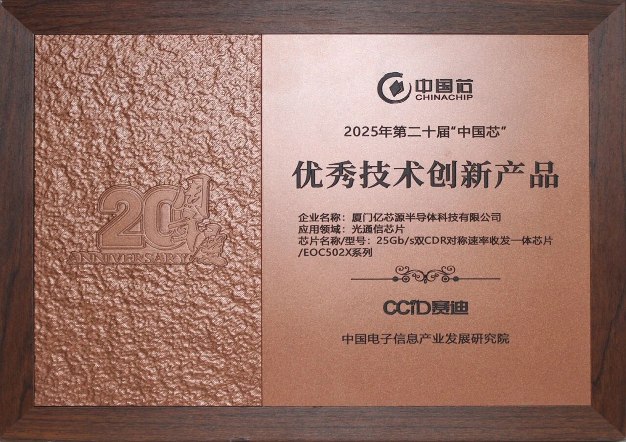 ICC訊 11月14日,2025年“中國芯”集成電路產(chǎn)業(yè)促進(jìn)大會暨第二十屆“中國芯”優(yōu)秀產(chǎn)品征集結(jié)果發(fā)布儀式在橫琴粵澳深度合作區(qū)隆重舉行。廈門億芯源自主研發(fā)的25Gb/s雙CDR對稱速率收發(fā)一體芯片,憑借卓越的技術(shù)創(chuàng)新實力與優(yōu)異的產(chǎn)品性能,成功摘得“中國芯”優(yōu)秀技術(shù)創(chuàng)新產(chǎn)品獎。這也是公司第四次入選“中國芯”優(yōu)秀產(chǎn)品榜單,進(jìn)一步彰顯了公司在高速光通信芯片領(lǐng)域持續(xù)的技術(shù)突破與深厚積累。