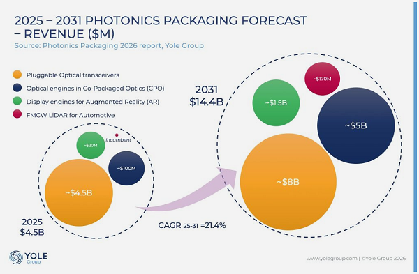 ICC訊 光子學(xué)持續(xù)推動計算、傳感和顯示領(lǐng)域的發(fā)展預(yù)期,但一個主要障礙依然存在:封裝。將光子器件集成到可靠、可擴(kuò)展的模塊和系統(tǒng)中,仍然是行業(yè)最復(fù)雜的挑戰(zhàn)之一。然而,這種復(fù)雜性也正在創(chuàng)造價值,預(yù)計到2031年,光子封裝(Photonics Packaging)市場將達(dá)到144億美元。來自AI基礎(chǔ)設(shè)施的需求,特別是在更高效、更高帶寬、更低功耗互連方面的需求,正在加速共封裝光學(xué)(CPO)的采用,同時增強(qiáng)現(xiàn)實(shí)和量子技術(shù)也正成為重要的增長驅(qū)動力。