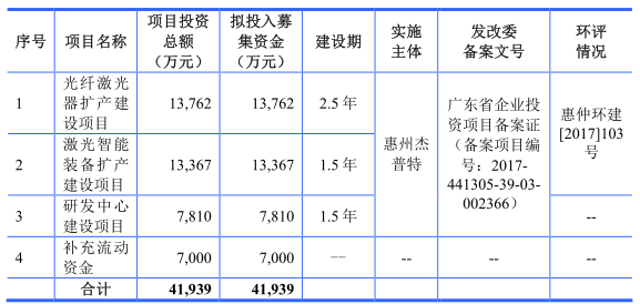 蘋果公司、華為和中興均在公司的前五大客戶。據(jù)招股書披露,杰普特本次IPO計(jì)劃募集資金4.19億元,其中7000萬補(bǔ)充流動(dòng)資金,其余用于光纖激光器擴(kuò)產(chǎn)建設(shè)、激光智能裝備擴(kuò)產(chǎn)和研發(fā)中心建設(shè)項(xiàng)目。