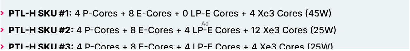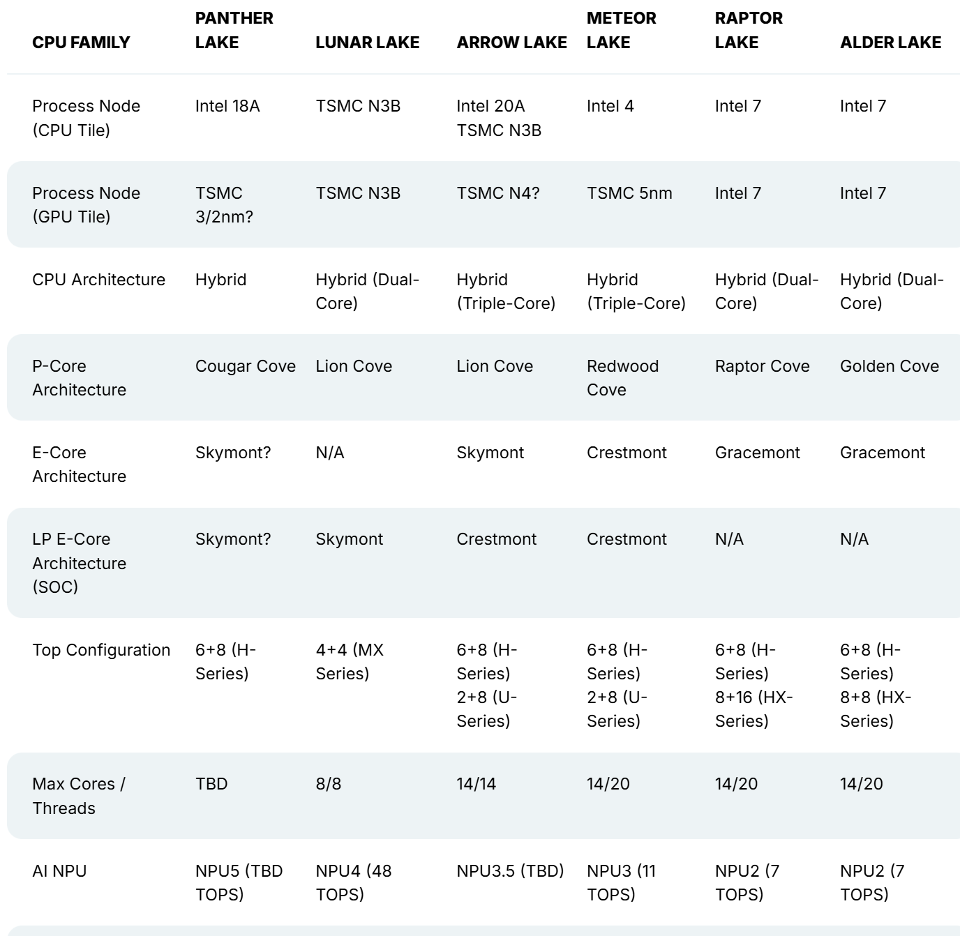 關(guān)于Panther Lake的簡(jiǎn)要介紹,“Core Ultra 300 ”SKU將采用Cougar Cove P-Cores和Skymont E-Cores,在板載iGPU方面,可能會(huì)采用Xe3形式的第三次重大Xe架構(gòu)更新,代號(hào)為Celestial,是Battlemage的繼任者。根據(jù)之前的傳言,以下是Panther Lake可能采用的SoC: