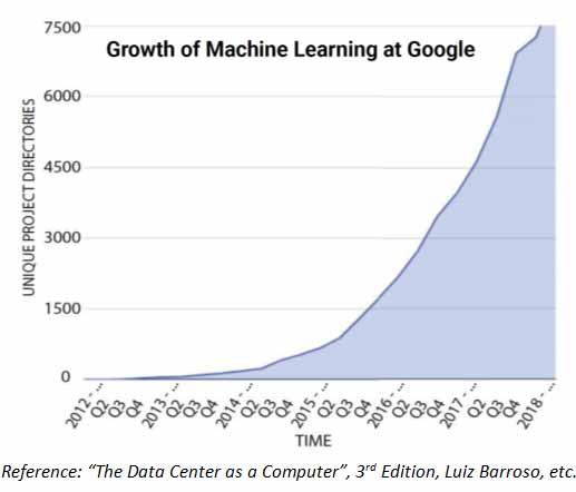 兩個關鍵因素對于云AI計算平臺的成功至關重要。一種是計算能力,另一種是分布式計算機之間的互連帶寬。從2012年到AlphaGo,計算能力以每3-4個月翻一番的驚人速度增長,這要歸功于針對分布式和并行計算進行了優(yōu)化的先進計算機處理器,例如圖形處理單元(GPU)和Tensor處理單元(TPU)。下圖顯示了Google AI/ML的增長,而曲棍球棒的增長率與其他主要的云AI/ML數(shù)據(jù)中心相似。作為結果,AI/ML已將東西向(east-west)內(nèi)部數(shù)據(jù)中心的流量推向了前所未有的高度。