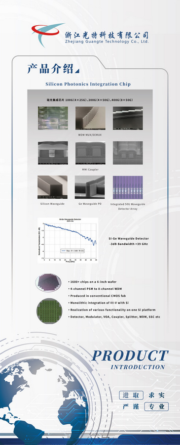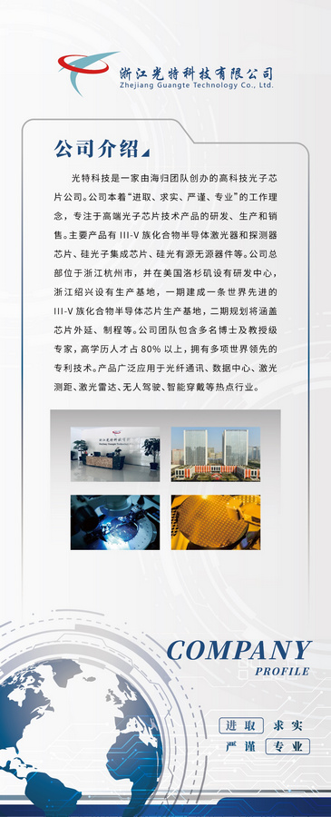 光特科技是一家由海歸團隊創(chuàng)辦的高科技光芯片公司。公司以“進取、求實、嚴(yán)謹(jǐn)、專業(yè)”為工作理念,專注于高端光芯片技術(shù)產(chǎn)品的研發(fā)、生產(chǎn)和銷售服務(wù)。主要產(chǎn)品有III-V族化合物半導(dǎo)體激光器和探測器芯片、硅光子集成芯片、硅光有源無源器件。公司團隊包含多名博士及教授級專家,高學(xué)歷人才占80%以上,擁有多項業(yè)內(nèi)領(lǐng)先的專利技術(shù)。產(chǎn)品廣泛應(yīng)用于光纖通訊、數(shù)據(jù)中心、激光測距、激光雷達、無人駕駛、智能穿戴等熱點行業(yè)。