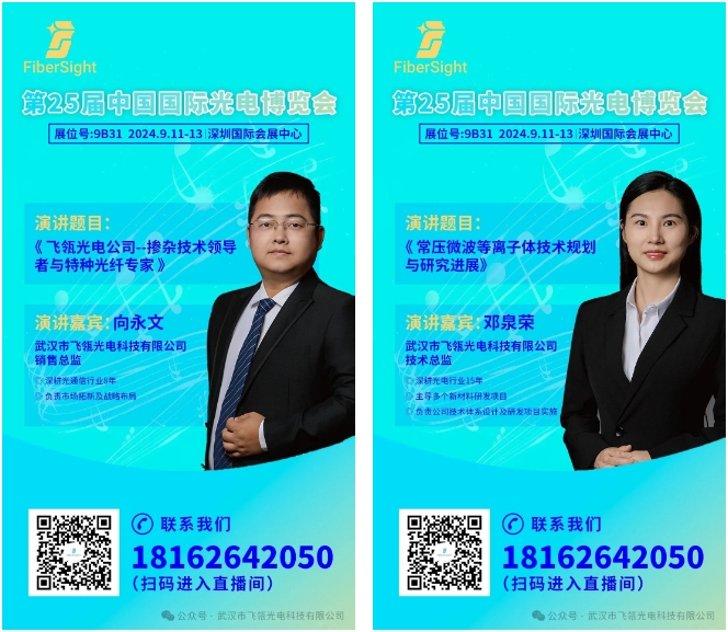 飛瓴光電技術(shù)總監(jiān)鄧泉榮博士也受湖北省光學(xué)學(xué)會、激光之家和中國光博會組委會邀約分別在9月10號14點深圳昌達(dá)酒店2A會議室和9月11日16點深圳國際會展中心2號館二樓2C會議室發(fā)布主旨演講《特種光纖常壓微波等離子體摻雜技術(shù)研究成果和展望》敬請期待!
