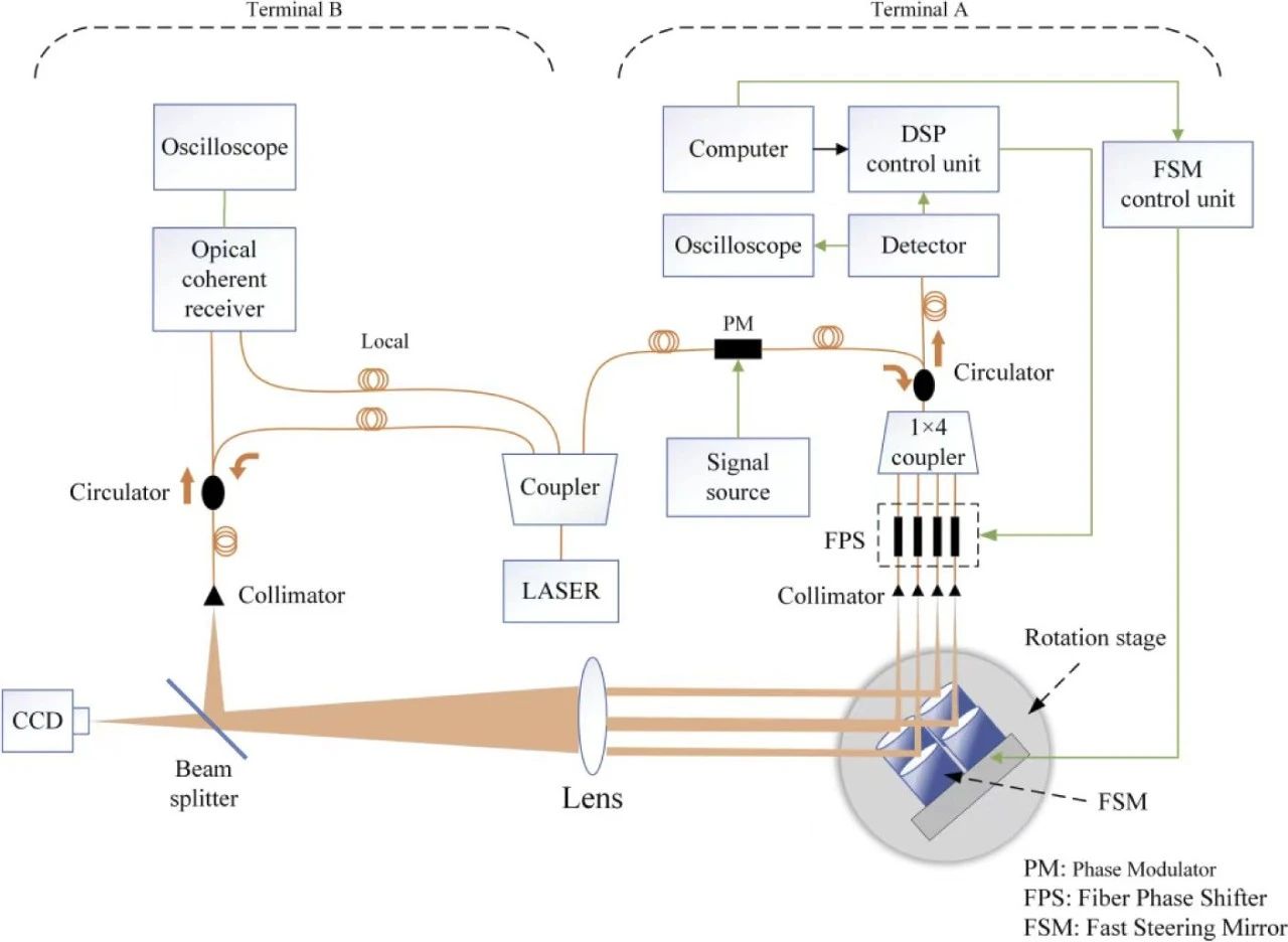 MEMS微振鏡基本原理是利用靜電力或者電磁力使得微型反射鏡發(fā)生偏轉(zhuǎn),由此使得入射到鏡面上的光束發(fā)生偏折。將MEMS和相控陣技術(shù)結(jié)合,通過(guò)微結(jié)構(gòu)的位移變化實(shí)現(xiàn)相位調(diào)制,從而達(dá)到光束偏轉(zhuǎn)控制。圖2為利用MEMS光學(xué)相控陣設(shè)計(jì)的空間通信系統(tǒng)。