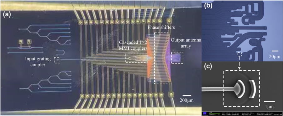 圖5 2D光學(xué)相控陣實(shí)物圖。(a) 封裝芯片的顯微圖像;(b) 輸出天線陣列的放大圖像;(c) 天線單元的SEM圖像