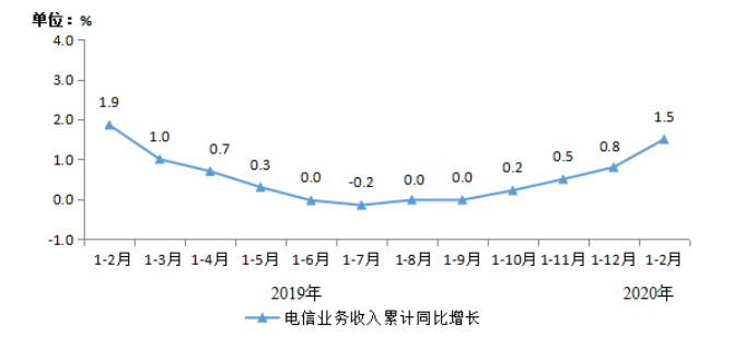 2020年1-2月,電信業(yè)務(wù)收入累計(jì)完成2242億元,同比增長1.5%,增速同比回落0.4個(gè)百分點(diǎn),但較上年末增幅提高0.7個(gè)百分點(diǎn)。按照上年不變價(jià)計(jì)算的電信業(yè)務(wù)總量完成2255億元,同比增長19.7%。