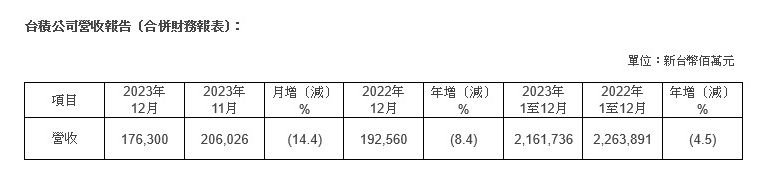 此外,臺積電2023年1至12月的營收約為新臺幣21617.4億元,較去年同期減少了4.5%。