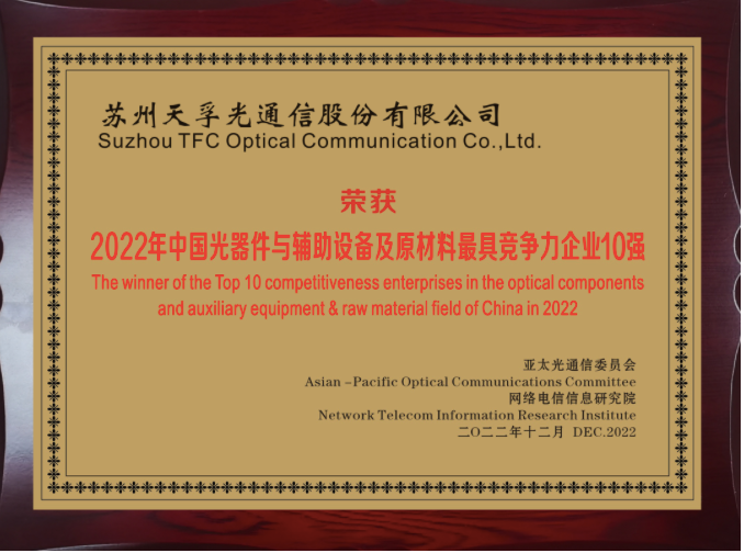 近日,由亞太光通信委員會(huì)和網(wǎng)絡(luò)電信信息研究院聯(lián)合主辦的2022全球|中國光通信最具競(jìng)爭(zhēng)力企業(yè)10強(qiáng)榜單線上重磅發(fā)布,蘇州天孚光通信股份有限公司(以下簡(jiǎn)稱“天孚通信”)連續(xù)五年榮登榜單,蟬聯(lián)2022年中國光器件與輔助設(shè)備及材料最具競(jìng)爭(zhēng)力企業(yè)10強(qiáng),充分體現(xiàn)了天孚通信在光通信行業(yè)細(xì)分領(lǐng)域的領(lǐng)先地位。