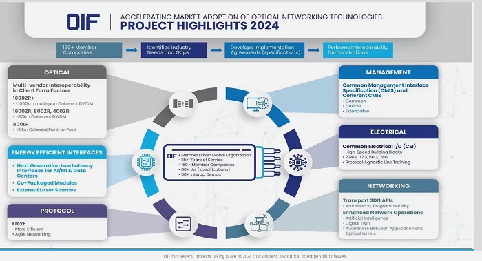 他說:“雖然OIF監(jiān)管著多個組件或獨立技術(shù)軌道,但關(guān)鍵是要從整體角度看待問題,以及我們?nèi)绾喂餐瑧?yīng)對當(dāng)前行業(yè)的熱點問題。我們可以將每個問題單獨深入研究,但重要的是,這些成員正在解決數(shù)據(jù)中心互連(DCI)問題、下一代數(shù)據(jù)速率、功率、管理與效率問題,以及與AI架構(gòu)相關(guān)的能耗問題。”