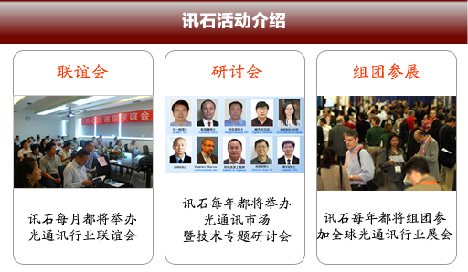 訊石信息咨詢(深圳)有限公司自成立以來(lái),舉辦各類活動(dòng)百余次,包括研討會(huì)、聯(lián)誼會(huì)、組團(tuán)參展等,廣受業(yè)內(nèi)人士好評(píng)。此外,訊石拜訪足跡遍布全球,為光通訊企業(yè)搭建溝通和交流的良好平臺(tái)?!盎顒?dòng)會(huì)友”成為訊石的特色,訊石將繼續(xù)發(fā)揚(yáng)這一優(yōu)勢(shì),更好的服務(wù)客戶!