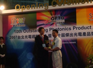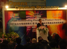 6月13日為光電展的開(kāi)幕式上,臺(tái)北光電周籌備會(huì)主委石大成博士發(fā)言并為十大杰出光電產(chǎn)品獎(jiǎng)獲得企業(yè)頒獎(jiǎng)。據(jù)石博士介紹,今年光電周系列展包括光電展、LED照明展,以及因應(yīng)全球綠色能源趨勢(shì),首度舉行的太陽(yáng)光電展等三大主題,及各式研討會(huì)、閉幕式與晚會(huì)、產(chǎn)品發(fā)表會(huì)及第十屆十大杰出光電產(chǎn)品獎(jiǎng)等活動(dòng),統(tǒng)稱臺(tái)北光電周系列活動(dòng)。今年光電展的光通訊和光學(xué)廠商包括亞洲光學(xué)、中華電信、光電科技工業(yè)協(xié)進(jìn)會(huì)(PIDA)、千才科技、東岳光電、偉電科技、超昱光電科技、泰華科技、巨晰光纖等。相比去年,本屆參展的光通訊公司是算多的,但總體上還是偏少。千才科技股份有限公司今年也是第一次參展。