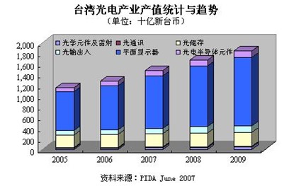 根據(jù)PIDA統(tǒng)計(jì)數(shù)據(jù),2006年,臺(tái)灣光電產(chǎn)業(yè)產(chǎn)值達(dá)到12744億新臺(tái)幣,相比2005年,增長(zhǎng)率為10.6%;PIDA預(yù)計(jì)到2009年,臺(tái)灣光電產(chǎn)業(yè)產(chǎn)值將達(dá)到18413億新臺(tái)幣。