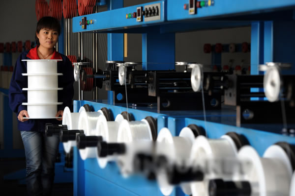江西大圣塑料光纖有限公司的一名員工在其國內(nèi)第一條日產(chǎn)80萬米通信用塑料光纖的生產(chǎn)流水線上作業(yè)。