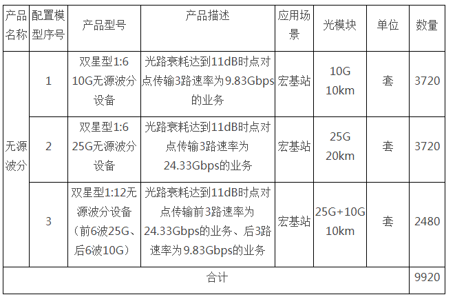 ICCSZ訊 (編輯:Nicole)湖南移動發(fā)布2020年無源波分設備采購項目招標公告(招標編號:HNYD20200000122),招標內(nèi)容為無源波分設備9920套,包括:3720套(雙星型1:6 )10G無源波分設備、3720套(雙星型1:6 )25G無源波分設備3720套、2480套雙星型1:12無源波分設備(前6波25G、后6波)。