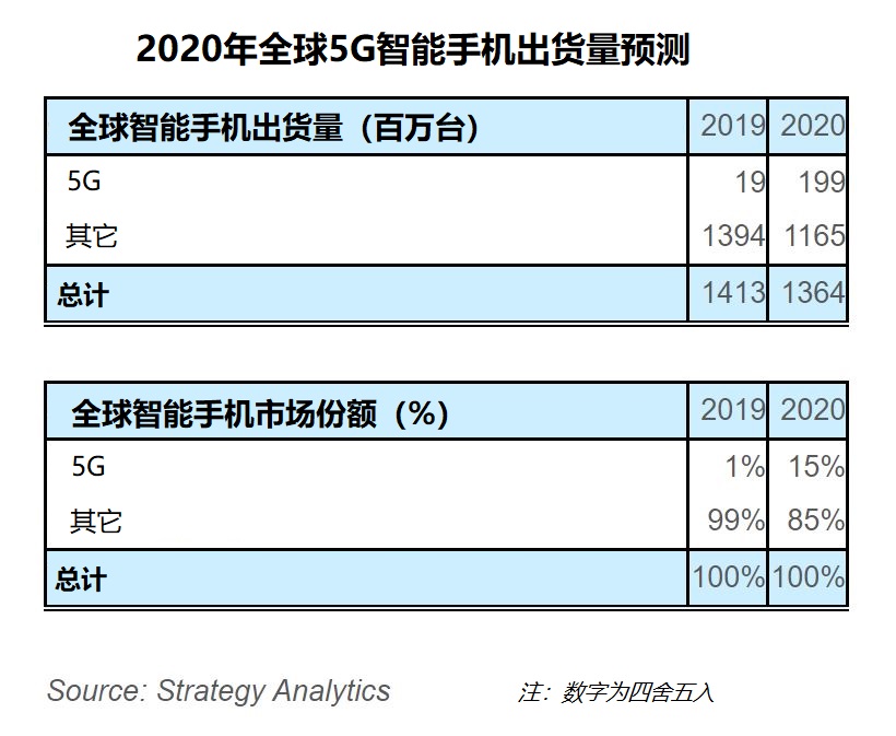 Strategy Analytics總監(jiān)Ken Hyers表示:“2020年全球5G智能手機出貨量將從2019年的1900萬臺增長超過十倍,達到1.99億臺。5G細分市場將成為今年全球智能手機行業(yè)增長最快的部分。 消費者希望更快的5G智能手機能夠體驗更豐富的內容,例如視頻或游戲。我們預測5G滲透率將從2019年全球所有智能手機出貨量的1%增長到2020年的15%?!?