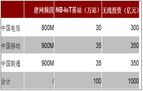 三家運營商 NB-IoT 全覆蓋至少 100 萬站,無 線投資 1000 億。其中,核心網(wǎng)建設占比 15%,無線網(wǎng)將建設占比 30%,配套及建設 費用等占比 55%。