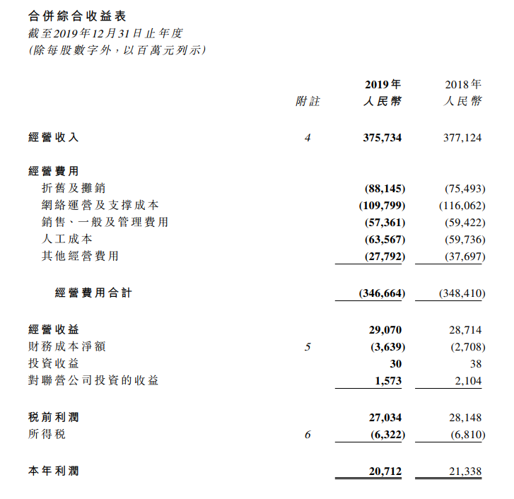 ICC訊(編輯:Debi)3月24日午間,中國電信公布截至2019年12月31日止之年度業(yè)績。2019年,公司經(jīng)營收入達(dá)到人民幣3,757億元,服務(wù)收入1達(dá)到人民幣3,576億元,同比增長 2.0%,繼續(xù)保持高于行業(yè)平均。其中,移動(dòng)服務(wù)收入達(dá)到人民幣1,755元,同比增長4.7%;固網(wǎng)服務(wù)收入約為人民幣1,821億元,同比下降0.4%;新興業(yè)務(wù)收入占服務(wù)收入比達(dá)到 55.3%,拉動(dòng)服務(wù)收入增長 4.5 個(gè)百分點(diǎn),收入結(jié)構(gòu)持續(xù)優(yōu)化,發(fā)展動(dòng)能不斷壯大。EBITDA3達(dá)到人民幣1,172億元,同比增長12.5%。凈利潤達(dá)到人民幣205億元,同比下降3.3%,較剔除中國鐵塔股份有限公司上市一次性稅后收益的 2018 年凈利潤增長 2.0%,每股基本凈利潤為人民幣 0.25 元。資本開支約為人民幣776億元,其中除5G以外的投資連續(xù)4年下降,自由現(xiàn)金流為人民幣 217 億元。