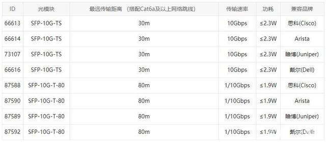不同型號(hào)萬兆電口模塊的功能特點(diǎn)如下表所示: