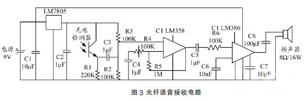 在接收器電路板上通過光電檢測器把光纖傳輸?shù)奈⑷豕庑盘栟D(zhuǎn)換為電信號,經(jīng)電容濾波、運算放大器放大,把電流信號轉(zhuǎn)換為電壓信號,放大到適合揚聲器輸出的電壓,恢復(fù)原始的語音信號。光纖語音接收電路如圖3 所示。