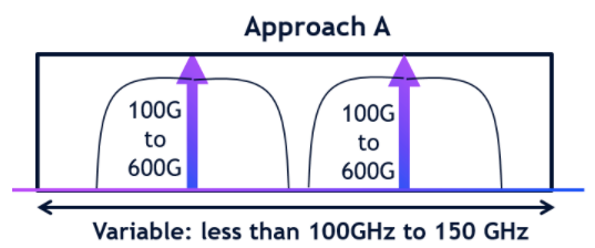 方法B:使用單個超強大載波,能夠?qū)崿F(xiàn)高達800G的帶寬,并且恒定的信道寬度剛好超過100GHz。